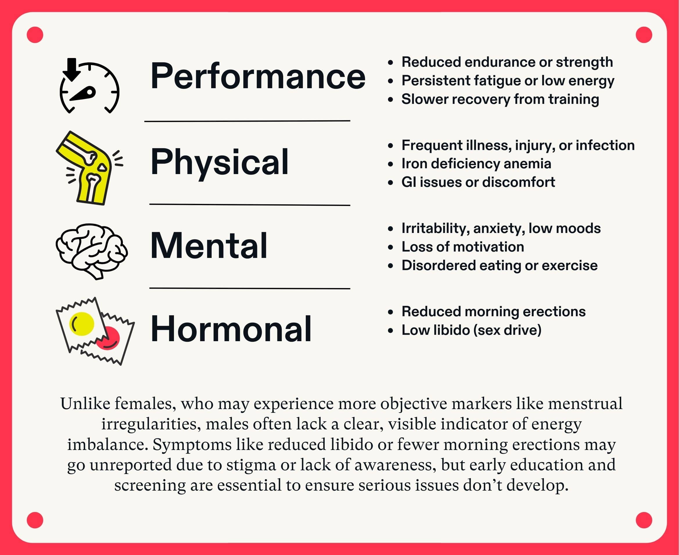 Many male athletes don’t realize their risk for REDs and may have a harder time recognizing the early warning signs. It’s essential to tune into your body and understand what it’s telling you.